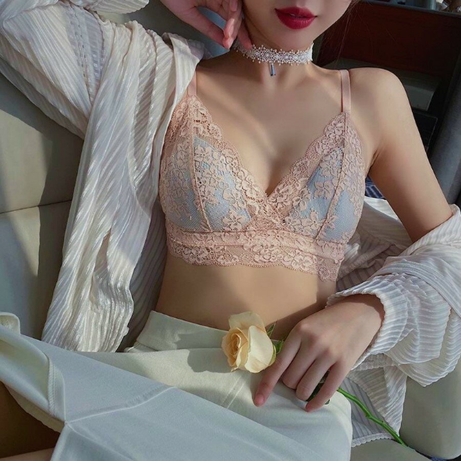 カップが透けている大胆レースデザインのノンワイヤーセットです。